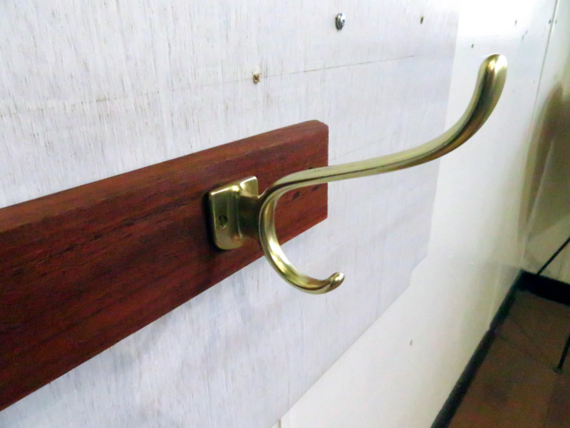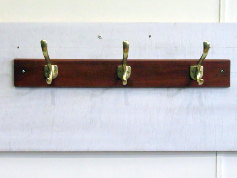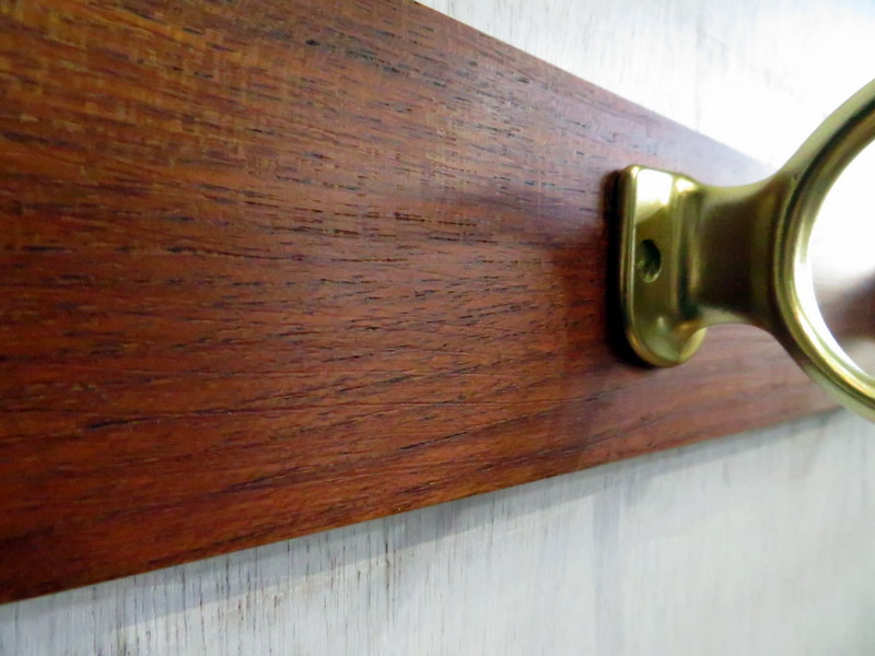 チークの無垢材に、金属製のハンガーフックが3本並びます。